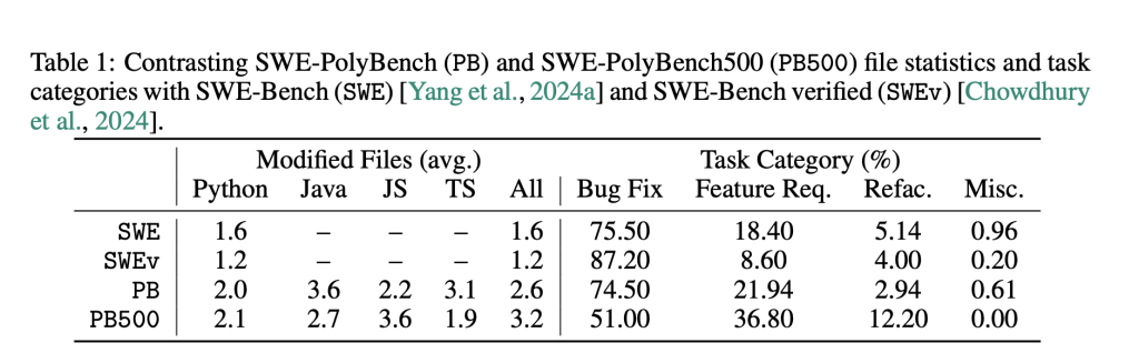 Unlike prior benchmarks, SWE-PolyBench incorporates real pull requests (PRs) that close actual issues and include associated test cases, allowing for verifiable evaluation. A smaller, stratified subset—SWE-PolyBench500—has also been released to support quicker experimentation while preserving task and language diversity.