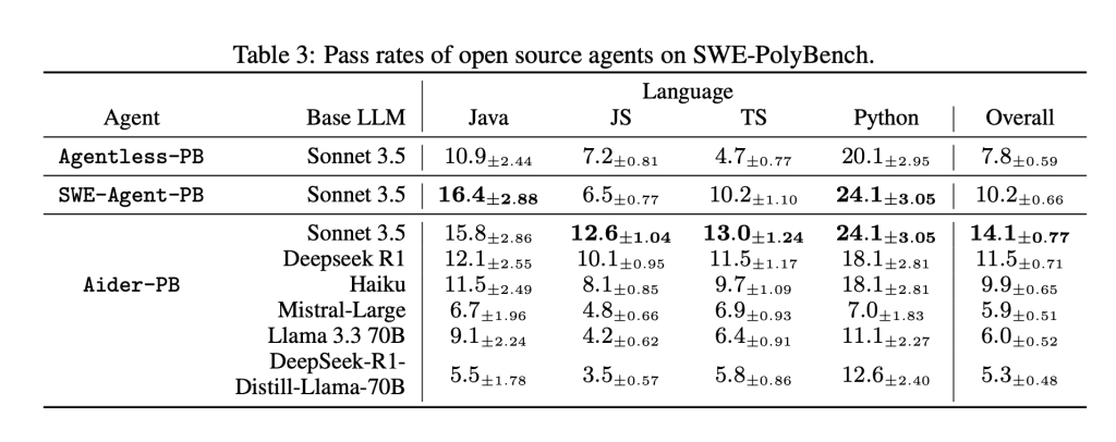 Three open-source coding agents—Aider, SWE-Agent, and Agentless—were adapted for SWE-PolyBench. All used Anthropic’s Claude 3.5 as the underlying model and were modified to handle the multilingual, repository-level requirements of the benchmark.