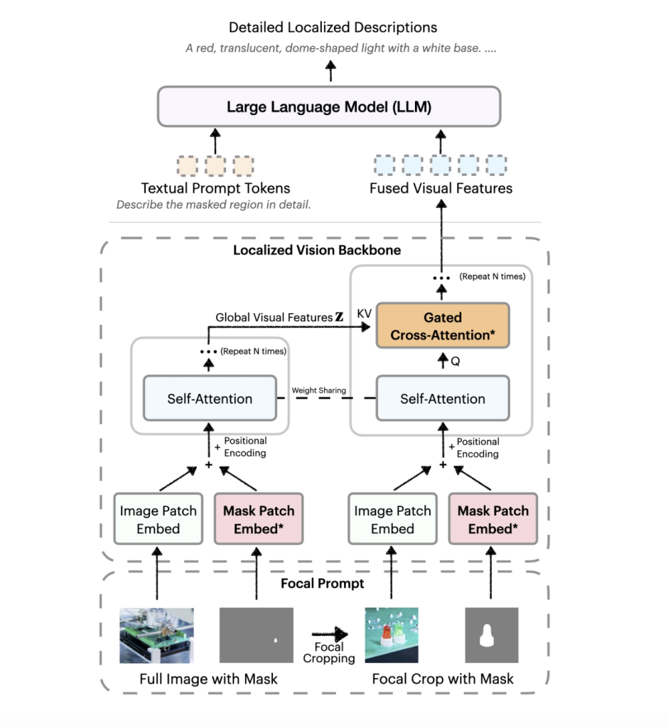 DAM-3B incorporates two principal innovations: a focal prompt and a localized vision backbone enhanced with gated cross-attention. The focal prompt fuses a full image with a high-resolution crop of the target region, retaining both regional detail and broader context. This dual-view input is processed by the localized vision backbone, which embeds the image and mask inputs and applies cross-attention to blend global and focal features before passing them to a large language model. These mechanisms are integrated without inflating token length, preserving computational efficiency.