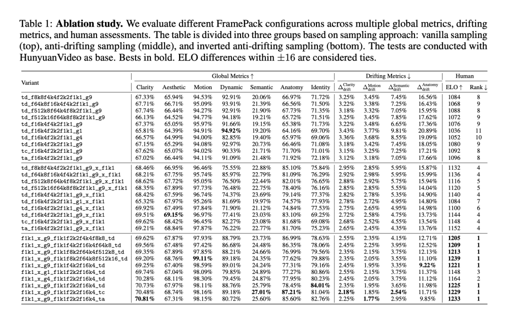 Performance metrics confirm the practical value of FramePack. When integrated into pretrained diffusion models like HunyuanVideo and Wan, FramePack reduced the memory usage per step while enabling larger batch sizes, up to the scale commonly used in image diffusion training. The anti-drifting techniques substantially improved visual quality. By reducing the diffusion scheduler’s aggressiveness and balancing the shift timesteps, the models showed fewer artifacts and greater frame-to-frame coherence. The inverted sampling approach, particularly, resulted in better approximation of known frames, enabling high-fidelity generation when a target image is known. These improvements occurred without additional training from scratch, demonstrating the adaptability of the FramePack module as a plug-in enhancement to existing architectures.