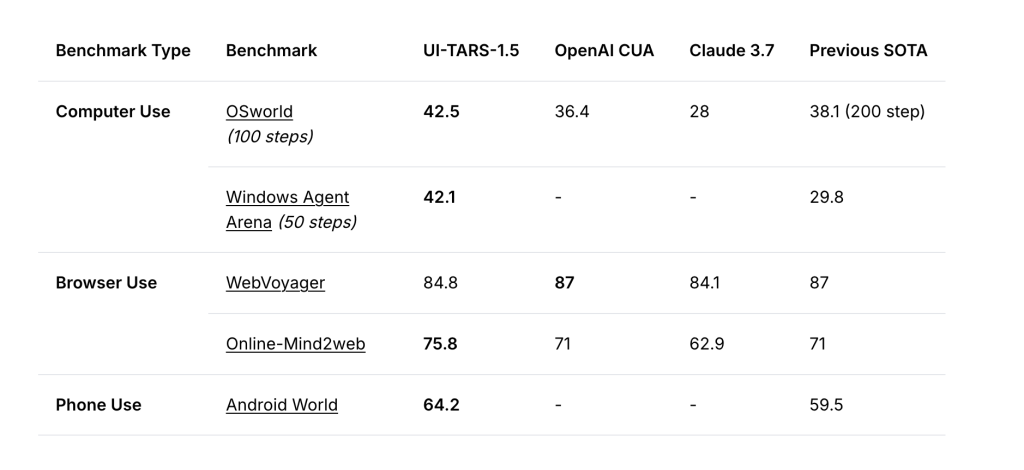 - OSWorld (100 steps): UI-TARS-1.5 achieves a success rate of 42.5%, outperforming OpenAI Operator (36.4%) and Claude 3.7 (28%). The benchmark evaluates long-context GUI tasks in a synthetic OS environment.