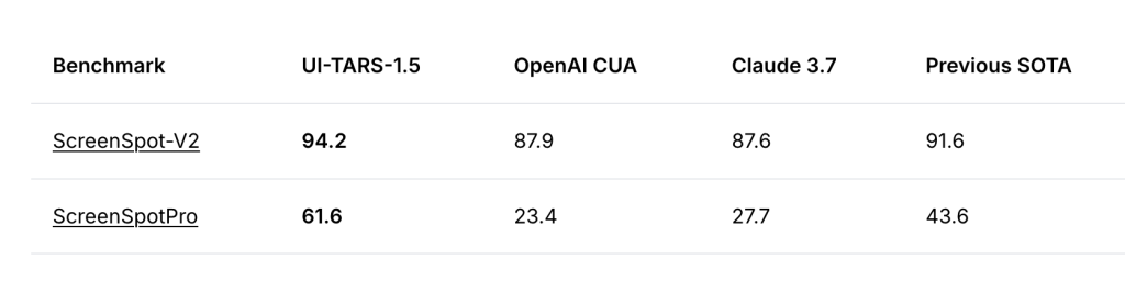 ByteDance has released UI-TARS-1.5, an updated version of its multimodal agent framework focused on graphical user interface (GUI) interaction and game environments. Designed as a vision-language model capable of perceiving screen content and performing interactive tasks, UI-TARS-1.5 delivers consistent improvements across a range of GUI automation and game reasoning benchmarks. Notably, it surpasses several leading models—including OpenAI’s Operator and Anthropic’s Claude 3.7—in both accuracy and task completion across multiple environments.