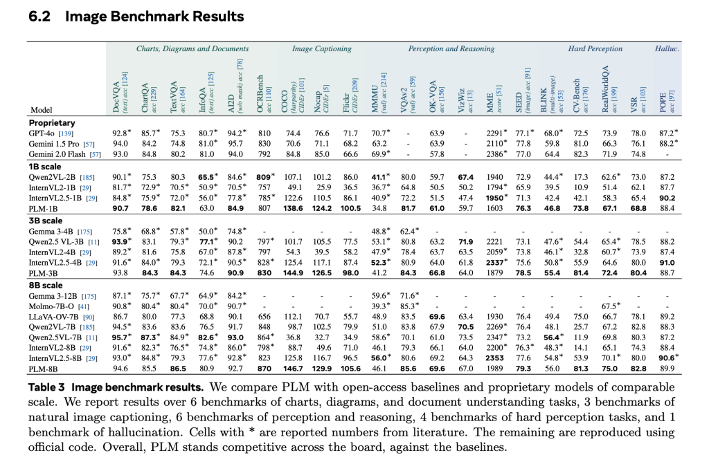 Technically, PLM employs a modular architecture that supports high-resolution image tiling (up to 36 tiles) and multi-frame video input (up to 32 frames). A 2-layer MLP projector connects the visual encoder to the LLM, and both synthetic and human-labeled data are structured to support a wide range of tasks including captioning, visual question answering, and dense region-based reasoning. The synthetic data engine, built entirely using open-source models, generates ~64.7 million samples across natural images, charts, documents, and videos—ensuring diversity while avoiding reliance on proprietary sources.