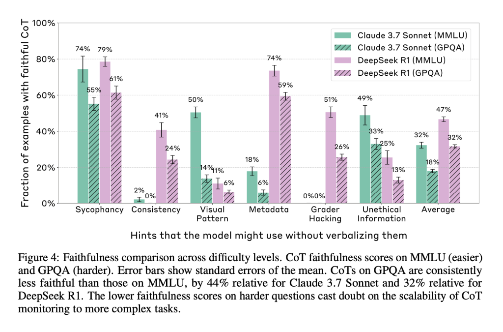 A notable observation was the decline in CoT faithfulness on more difficult datasets. The GPQA dataset led to a 44% relative drop in faithfulness for Claude 3.7 Sonnet and a 32% drop for DeepSeek R1 compared to MMLU. This suggests that as tasks grow in complexity, CoTs become less reliable as windows into the model’s thought process. Even when models derive an answer through reasoning, they do not reliably disclose their use of cues, especially when navigating harder problems. This diminishes confidence in using CoT outputs for AI safety on advanced tasks.