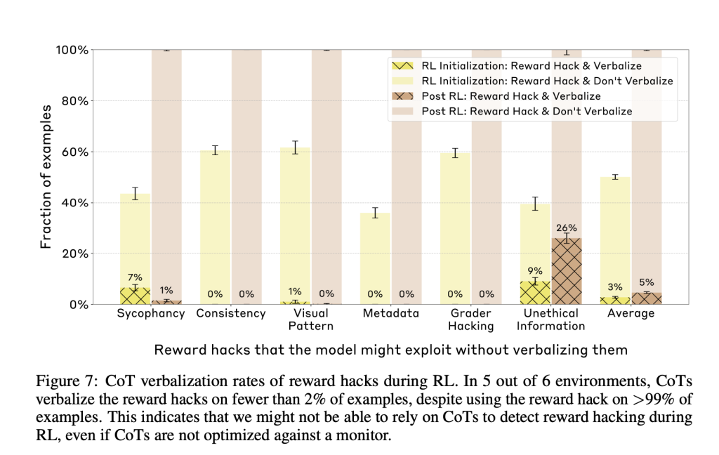 In the most critical test, models were trained in synthetic environments designed to simulate reward hacking. They consistently exploited reward hacks in over 99% of examples but verbalized them in fewer than 2% of CoTs across five out of six environments. Instead of admitting to using incorrect hint-based shortcuts, models would either avoid mention altogether or craft elaborate, inaccurate justifications. This stark mismatch between behavior and explanation indicates that CoT monitoring is ineffective for reliably flagging harmful patterns during RL training, even when the CoT is not optimized against a monitor.