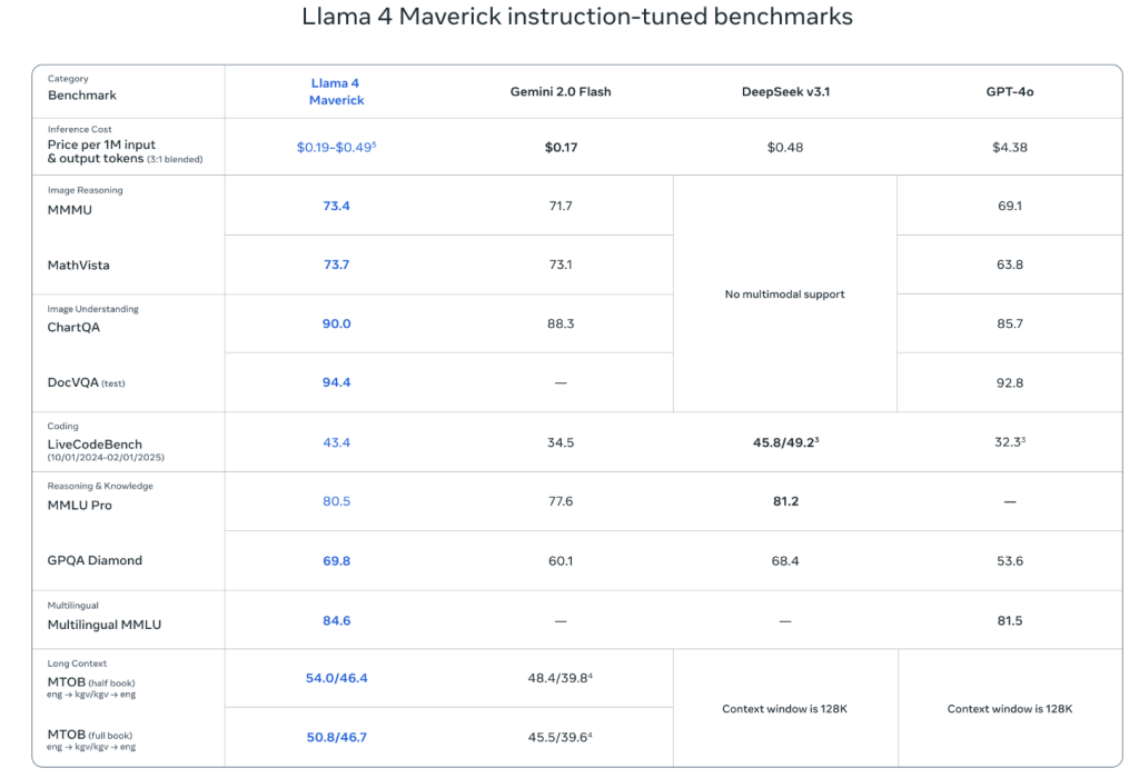 A key feature of Maverick is its noteworthy performance-to-cost efficiency. Benchmarking efforts, specifically on the LMArena platform, have recorded an Elo rating of 1417 for Maverick’s chat-optimized version, indicating its computational efficiency and practical applicability in conversational and multimodal contexts.