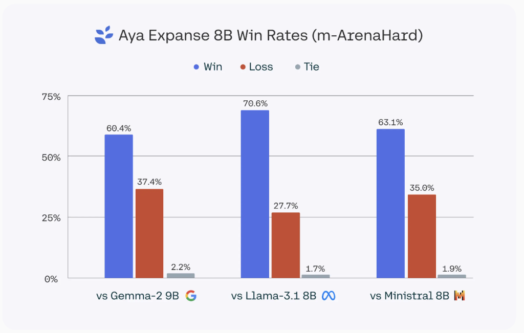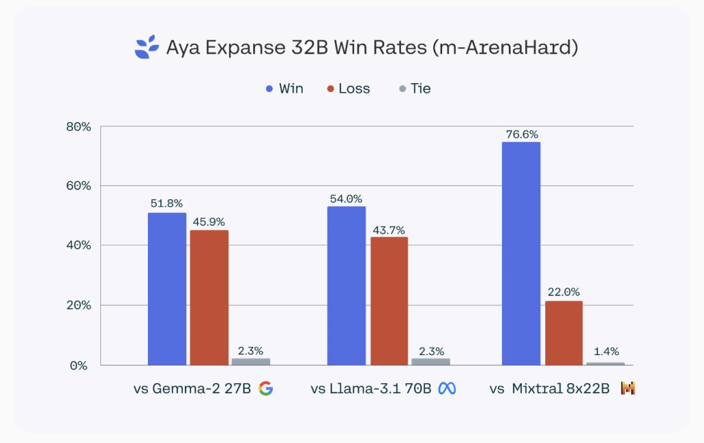 Cohere for AI Introduces Aya Expanse: an open-weights state-of-art family of models to help close the language gap with AI. Aya Expanse is designed to expand language coverage and inclusivity in the AI landscape by providing open-weight models that can be accessed and built upon by researchers and developers worldwide. Available in multiple sizes, including Aya Expanse-8B and Aya Expanse-32B, these models are adaptable across a wide range of natural language tasks, such as text generation, translation, and summarization. The different model sizes offer flexibility for various use cases, from large-scale applications to lighter deployments. Aya Expanse utilizes advanced transformer architecture to capture linguistic nuances and semantic richness, and it is fine-tuned to handle multilingual scenarios effectively. The models leverage diverse datasets from low-resource languages like Swahili, Bengali, and Welsh to ensure equitable performance across linguistic contexts.