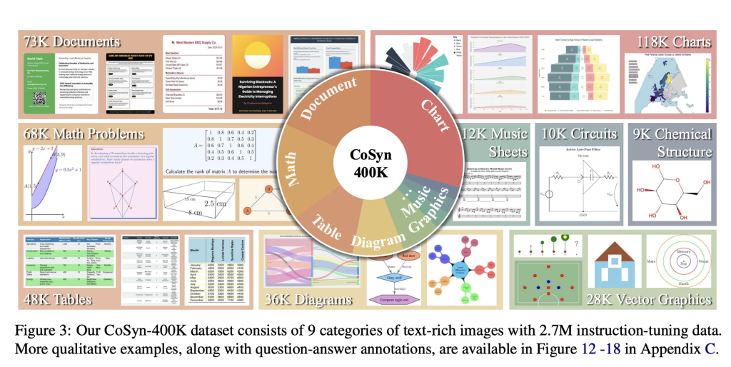 A team of researchers from University of Pennsylvania, and Allen Institute for Artificial Intelligence introduced the Code Guided Synthetic Data Generation System (CoSyn) which offers a flexible framework to address the challenges in text-rich image processing by creating diverse synthetic multimodal training data. This innovative system utilizes the code generation capabilities of text-only LLMS to produce both data and rendering code for various text-rich visual formats using 11 supported rendering tools including Python, HTML, and LaTeX. CoSyn generates not only the images but also corresponding textual instructions grounded in the underlying code representation, creating comprehensive vision-language instruction-tuning datasets. The researchers used this framework to develop CoSyn-400K, a large-scale diverse synthetic dataset specifically designed for text-rich image understanding.