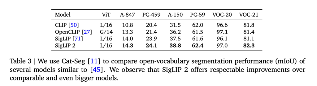 For multilingual image–text retrieval tasks, such as those evaluated on Crossmodal-3600, SigLIP 2 performs competitively with models designed exclusively for multilingual data. At the same time, it maintains strong performance on English-centered tasks. This balance is achieved through careful data curation and training methods that emphasize both semantic richness and localization precision. In dense prediction tasks, such as semantic segmentation, depth estimation, and surface normal prediction, the model’s advantages are again evident. When tested on open-vocabulary segmentation frameworks like Cat-Seg, SigLIP 2 consistently reports higher mean Intersection-over-Union (mIoU) scores compared to its predecessors and other open-weight models. These results are a testament to the model’s ability to capture intricate details in images.