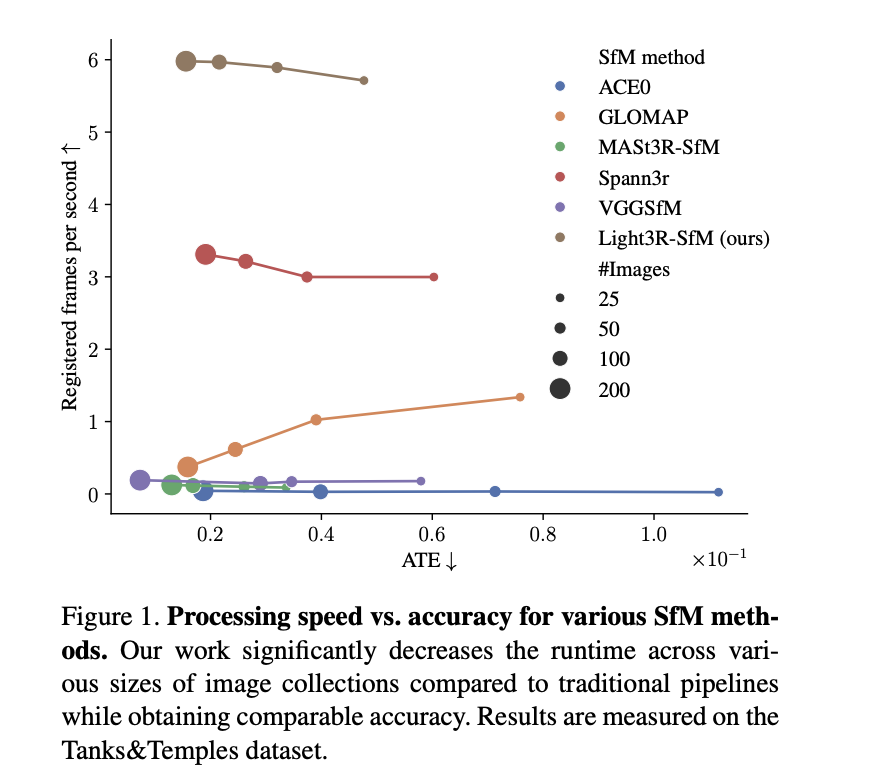 To solve these issues, researchers from NVIDIA, Vector Institute, and the University of Toronto proposed Light3R-SfM, a fully learnable feed-forward Structure-from-Motion (SfM) model designed to estimate globally aligned camera poses from unordered image collections without requiring computationally expensive global optimization. Unlike conventional SfM techniques, it incorporates an implicit global alignment module in the latent space, enabling efficient multi-view feature sharing before performing pairwise 3D reconstruction. Light3R-SfM differs from Spann3R, which utilizes an explicit memory bank for online reconstruction that can drift over time, focusing on offline reconstruction from unordered images. It employs a scalable attention mechanism for global information exchange, improving accuracy while reducing runtime. Compared to MASt3R-SfM, Light3R-SfM reconstructs a 200-image scene in 33 seconds, achieving a 49× speedup over the 27-minute runtime of MASt3R-SfM.