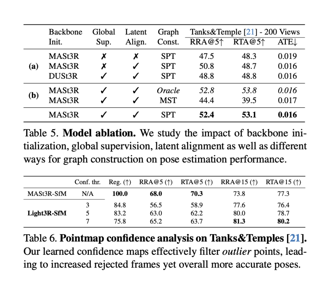 Researchers evaluated multi-view pose estimation on the Tanks&Temples dataset, comparing their method, Light3R-SfM, with optimization-based (OPT) and feedforward-based (FFD) approaches across different view settings. Using metrics such as relative rotation and translation accuracy (RRA, RTA), absolute translation error (ATE), registration rate, and runtime on an NVIDIA V100-32GB, they found that Light3R-SfM significantly outperformed Spann3R, the only other FFD method. It achieved 145% higher RRA and 84% higher RTA while running nearly twice as fast. Although OPT methods like Colmap and Glomap offered better accuracy through bundle adjustment, they required up to 43× more runtime, making them less scalable. Unlike Spann3R, which struggled with unordered images and suffered from high computational costs due to exhaustive pairwise comparisons, Light3R-SfM demonstrated superior efficiency and accuracy, making it a more practical solution.