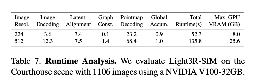 In summary, the proposed method replaced traditional matching and global optimization with 3D foundation models and a scalable latent alignment module. This approach reduced runtime while maintaining competitive accuracy, offering a practical alternative to optimization-based methods. However, it has limitations regarding scalability to large image collections and accuracy at tight thresholds, likely due to the low resolution of images. Despite these limitations, this method may serve as a foundation for more promising work in the area, where potential improvements would be related to scalability and accuracy improvement and more robust feature alignment techniques.