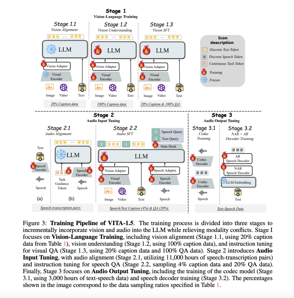 VITA-1.5 is built to balance efficiency and capability. It uses vision and audio encoders, employing dynamic patching for image inputs and downsampling techniques for audio. The speech decoder combines non-autoregressive (NAR) and autoregressive (AR) methods to ensure fluent and high-quality speech generation. The training process is divided into three stages:
