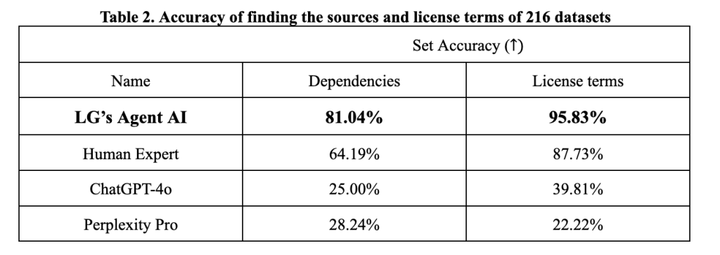 Other notable results include: when evaluating 216 randomly chosen datasets from Hugging Face’s top 1,000+ downloads, Agent AI accurately detected dependencies by around 81.04% and identified license documents by about 95.83%.