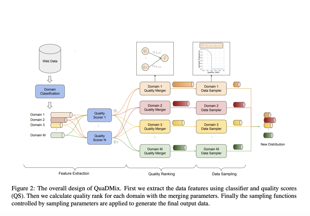 QuaDMix operates in three principal stages: feature extraction, quality aggregation, and quality-diversity aware sampling. Initially, each document is annotated with domain labels and multiple quality scores. These scores are normalized and merged using domain-specific parameters to compute an aggregated quality score. Documents are subsequently sampled according to a sigmoid-based function that prioritizes higher-quality samples while maintaining domain balance through parameterized controls.