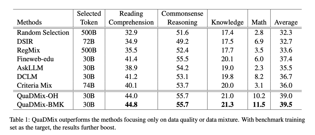 Validation experiments were conducted using the RefinedWeb dataset, training 530M parameter models from scratch. QuaDMix was compared against several baselines, including Random Selection, Fineweb-edu, AskLLM, DCLM, DSIR, and RegMix. QuaDMix consistently outperformed these methods, achieving an average score of 39.5% across nine diverse benchmarks.